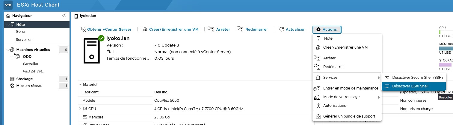 - Cliquer sur Activer Secure Shell (SSH) et activer ESXi Shell