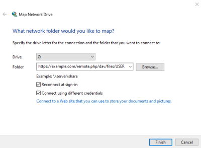 - Saisir l'URL suivante dans la case “Dossier”: https://cloud.anemoneprune.tk/remote.php/dav/files/USERNAME/. Remplacer “USERNAME” par votre nom d'utilisateur et cochez la case “Se connecter à l'aide d'informations d'identification différentes”